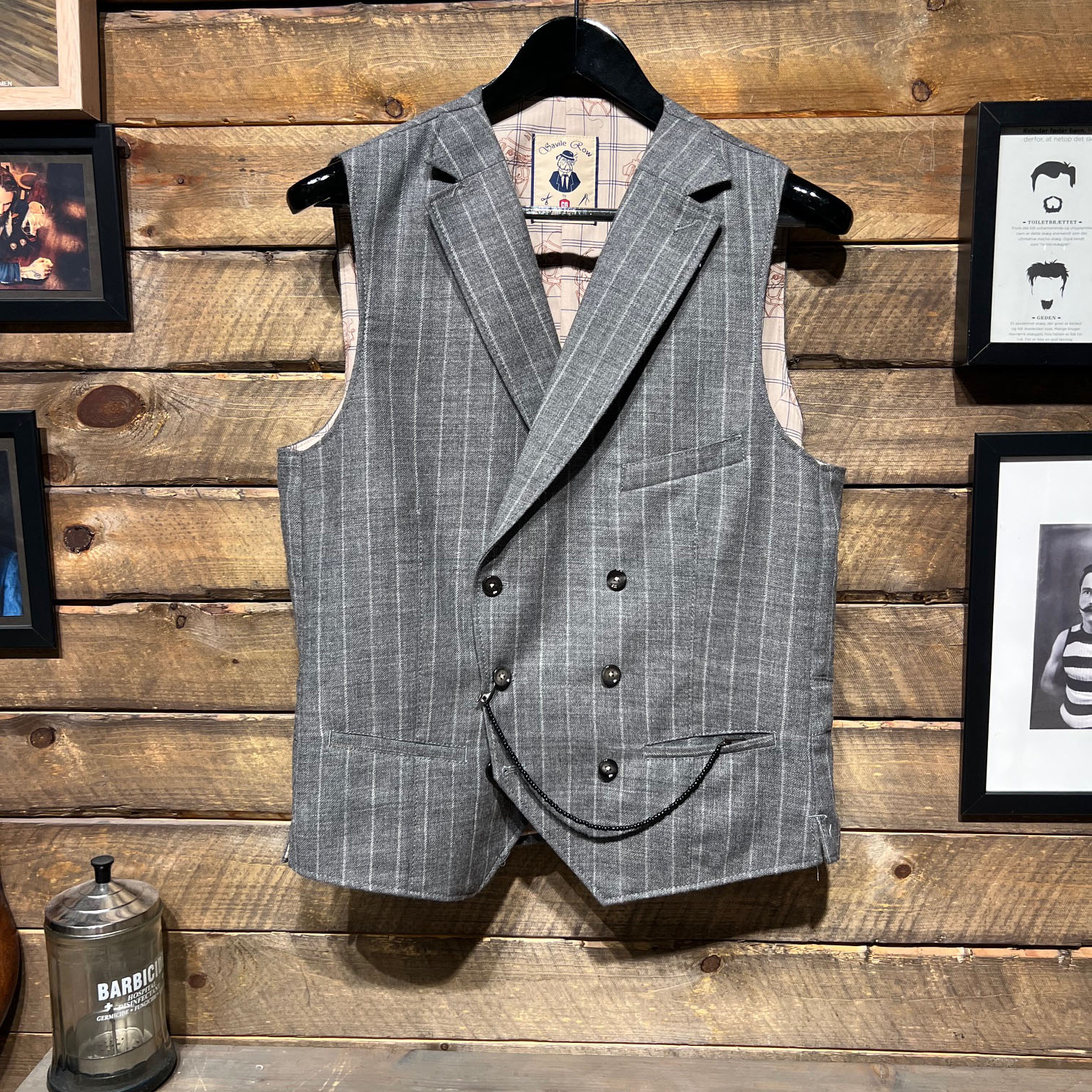 Ternet dobbelt radet vest fra tyske Club of Gents. Lavet i en elegant og flot metervare i ren uld, som giver varen en lethed samt en flot struktur og leder tankerne hen på Capone-tiden.