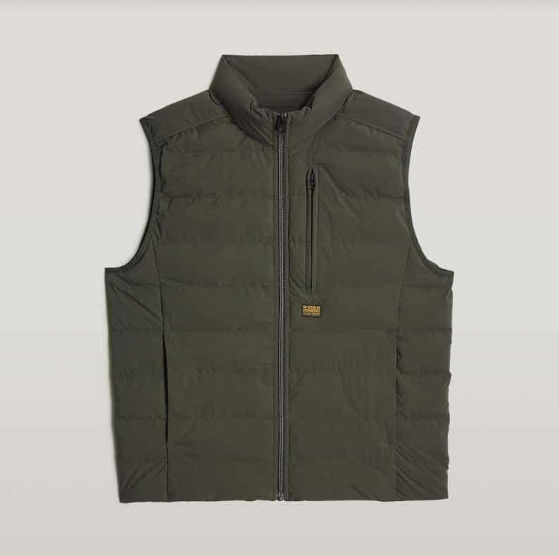 Ensfarvet quiltet vest fra hollandske G-Star Raw. Lavet i en letvægts kvalitet, som gør den yderst komfortabel at have på. Brug den gerne med en strik under på en kølig dag.