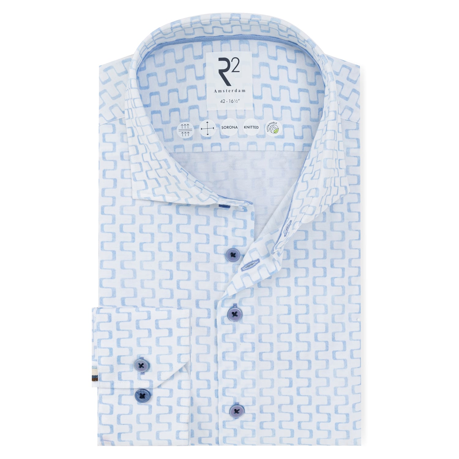 Mønstret skjorte fra hollandske R2 Amsterdam. Lavet i super fleksibel og blød metervare, som gør skjorten enormt komfortabel at have på hele dagen. Ideel sammen med en vest, der giver et cool look.